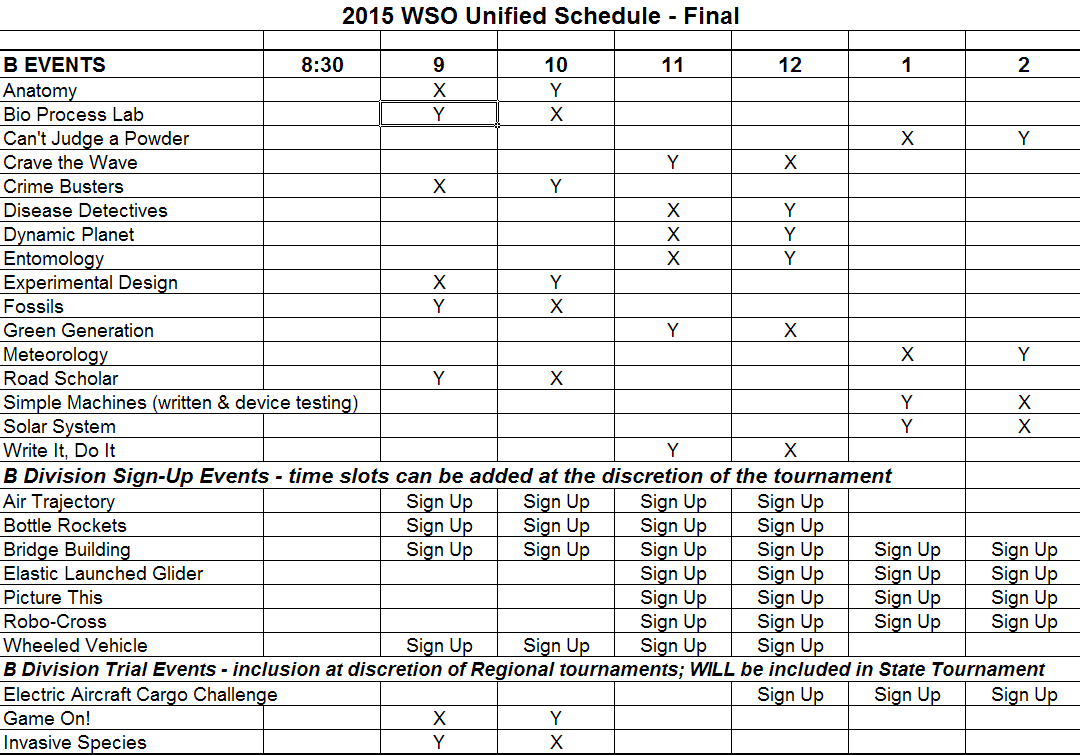 The final unified schedule (that all competitions will adhere to) also has been posted. The Div. B schedule is unchanged. Additional sign up times have been added for Div. C; also, Protein Modeling is now sign up and the test has been moved to 8:30 for all teams regardless of X/Y status.