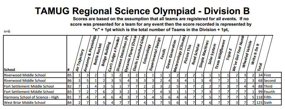 In B division for the Galveston Regional, Riverwood won 1st and Fort Settlement took 2nd. It was Fort Settlement's first regional competition and they will debuting at state as well.
