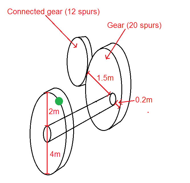 My reasoning was that the size of the circle made by the green point is equal to the size of the circle made by the center of the axle; since the axle is 0.65 meters offset from the center of the 20 spur gear, the circumference of that would be 1.3π, multiplied by 60% is 2.45... I think I just answered my own question. Anyway, I'll just give you the next turn.plaid suit guy2 wrote:Can you explain your reasoning? The way I see it, the small gear makes the big gear rotate 60% of a rotation, which is directly connected to the wheel, and therefore must also go through 60% of a rotation. Thus it's just 60% of it's circumference of 4πm, which is 7.34m