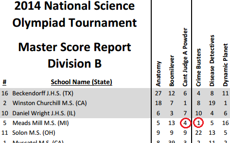 As for what I know off the top of my head, if my teammates told me correctly (and if I recall correctly), Lakeshore Middle School was somewhere in the 180s and Meads Mill was somewhere in the 150s (once again, I'm just going off what I heard from other people, I too still am waiting for the results to be posted online for definitive results).