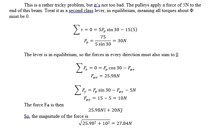 Ohh... I just made a math error, subsequently fixed it to figure out how to solve the problem, then remade the same error while actually calculating the answer...plaid suit guy2 wrote:It't just ends up as 27.84N (exactly as written on the piece of paper I wrote the solution on last night at like 10:30. Tired me is better as physics, as it turns out)