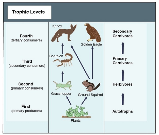 Series of organisms/species that consume one another. Autotroph: an organism that makes its own food (typically through photosynthesis). Heterotroph: an organisms that consumes another organism or byproduct of another organism for food. Decomposer: an organisms that breaks down nutrients and detritus to be re-used. Herbivore: An organism that eats only plants. Carnivore: An organism that eats only meat. Omnivore: NA organism that eats both plants and meat. Trophic Level: point in the food web where energy is passed to and from organism.