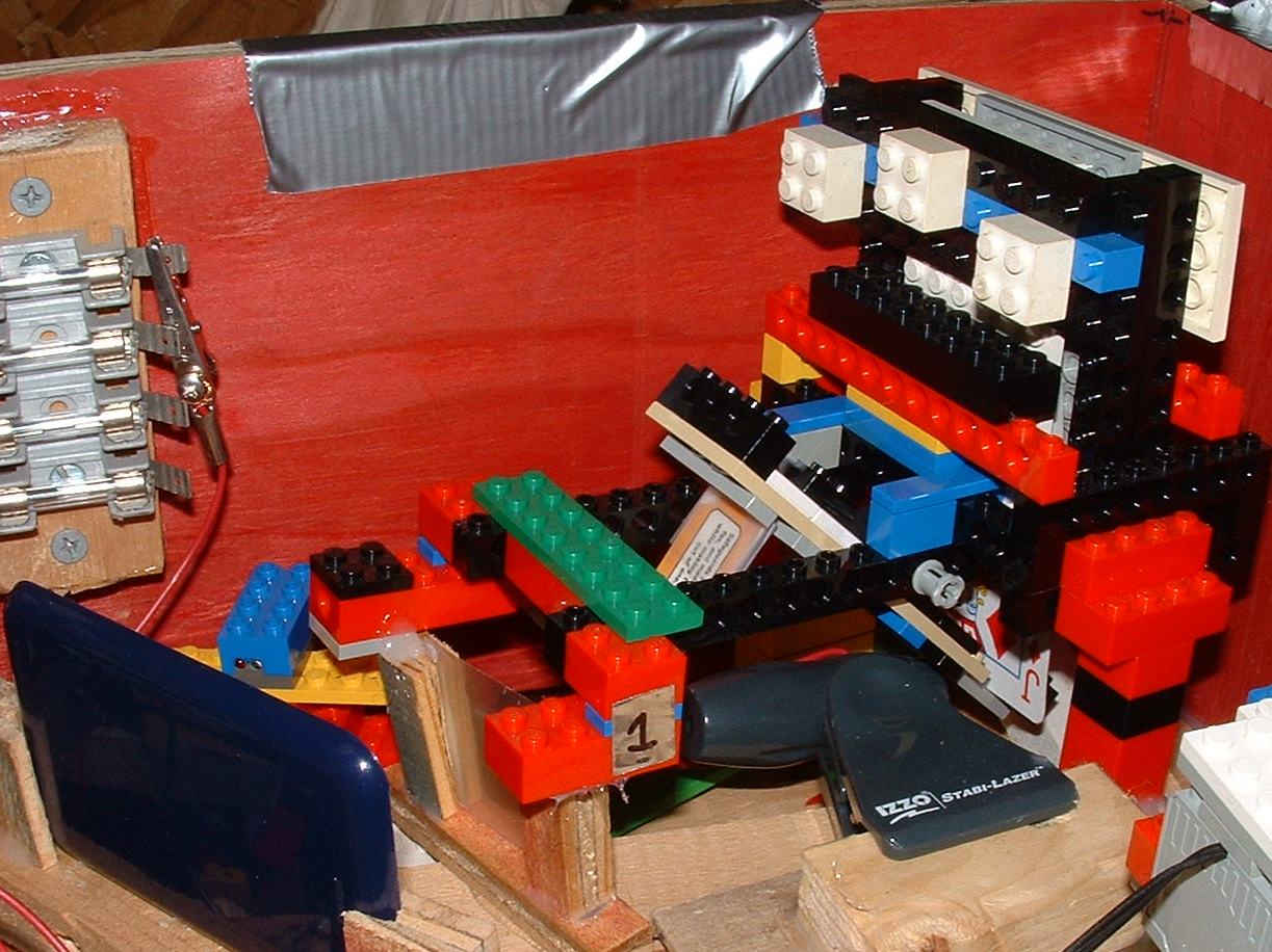 This machine was not nearly as successful as my entry in 2005. This is mostly my fault, rather than the machine's. At nationals, I was nervous and over-volted my laser, which broke it (goodbye starting transfer). I also forgot to uncap the sharpie that was supposed to draw a figure-8 on the post-it. I also misaligned the squirt gun and it got water on a judge :P. Nationals was in Juniata that year and it rained. A lot. My static detector, which was a little gimpy to start with, failed completely. Needless to say, I went into 2005 having learned some lessons about building machines and not screwing up from being nervous.