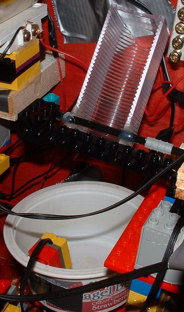 | Motor turns, dumping Na2CO3 into jar | Mechanical | This is an example of chemical precipitation, which was a bonus that year. I kept the darker half of the solution, the ferric chloride, in the test tube (which had the light beam passing through it to the light sensor) so that it was demonstrable that it was not the color of the two components separately, but the actual precipitation reaction that triggered the next transfer. I got the ferric chloride from my chem teacher and the washing soda from the grocery store. | ||||