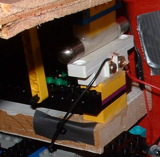 | 8 | Formerly suspended weight is dropped | Mechanical | 10 | There were two bonuses here, one for storing energy in a spring and one for releasing energy from a spring. Neither were allowed to be "spurs". The weight it shown hooked onto the hook from which it would usually be suspended with fishing line. You can see one of the alligator clips that held the Nichrome wire. When the weight was released, it fell down the tube and compressed a fairly powerful spring (storing energy in a spring). Underneath the spring was a momentary switch, which was in turn depressed by the spring. The spring then lifted the weight (releasing energy from a spring) and the switch at the bottom was released. This oscillation happened a few times. The switch at the bottom controlled a solenoid, which was pressing and releasing a touch sensor as the switch at the bottom of the tube was pressed and released. The RCX program counted the number of press/releases and would only trigger the next transfer after x cycles. This demonstrated that the spring's oscillation and sequential storage and release was vital to the operation of the machine. | ||