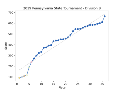 2019 saw one of the most competitive Division B tournaments in state history, with defending champion Springhouse Middle School, longtime contenders Bala Cynwyd Middle School and Shady Side Academy Middle School, and relative newcomer Harlan Rowe Middle School all within 24 points of each other. Ultimately, Springhouse defended their title, winning their fifth consecutive state championship with a score of 92, and Harlan Rowe emerged with a score of 101 to win second place, and earn their first trip to the national tournament in school history. It was also the first time a team representing the Northeast Regional qualified for the national tournament since Stroudsburg Junior High School won the 2006 tournament.