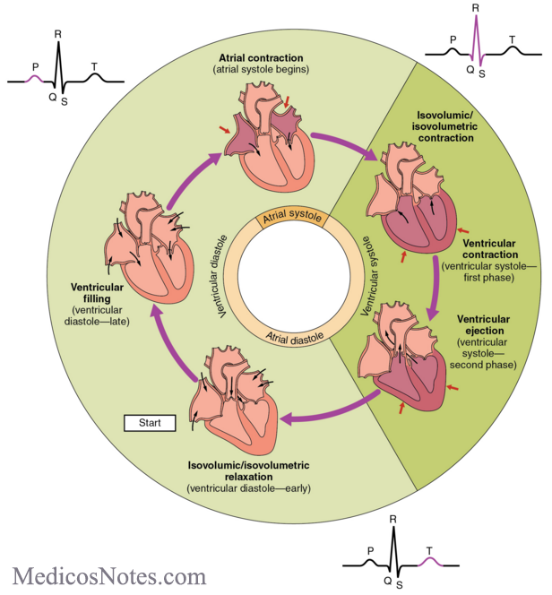 The cardiac cycle refers to the sequences of events that occur in a single heartbeat. Blood flows due to pressure changes in the heart—the contraction of the muscle cells in the heart forces blood between chambers. Systole refers to contraction of the ventricles: both isovolumetric contraction and ejection are part of systole. The other phases (isovolumetric relaxation, rapid filling, and atrial contraction) are a part of diastole, which occur when the ventricles are relaxed. The heart pumps in two steps: both atria contract almost simultaneously before both ventricles contract almost simultaneously 0.1 to 0.2 seconds later. The entire cardiac cycle takes around 0.8 seconds at an average cardiac rate of 75 bpm. 0.5 seconds are spent in diastole, while the other 0.3 seconds are spent in systole.