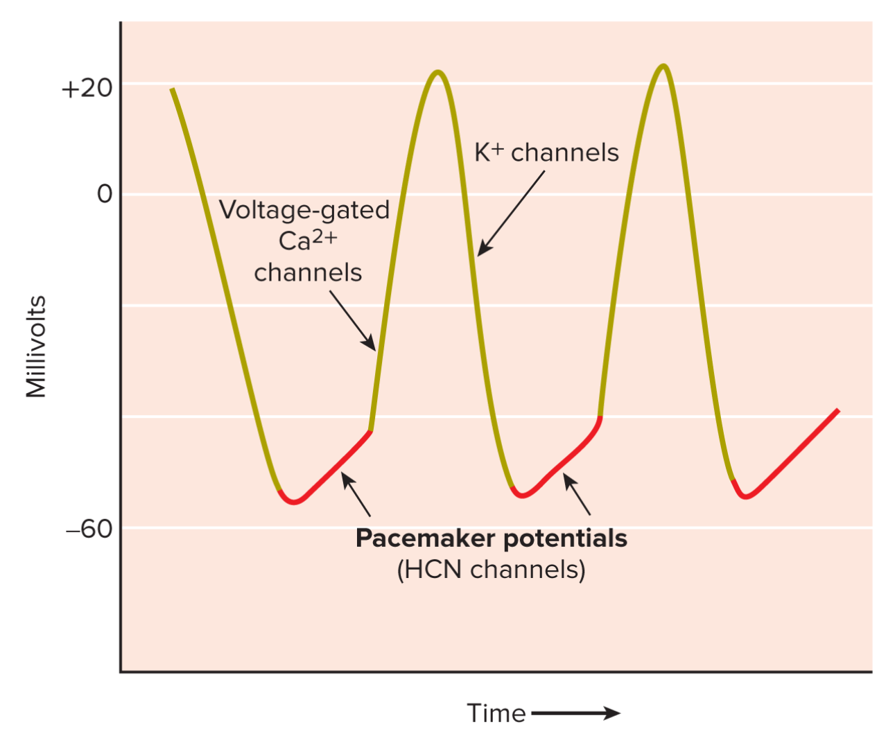 Once the cell has reached a membrane potential of approximately -40 mV, voltage-gated Ca2+ channels in the plasma membrane open and allow calcium ions to enter the cell. This causes a sharp increase in the membrane potential, resulting in an action potential. The pacemaker cells repolarize due to the opening of voltage-gated potassium ion channels, causing the membrane potential to fall back to approximately -50 mV. The HCN channels open, and the pacemaker potential occurs once again.