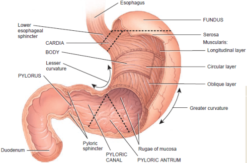 - There are three main sections to the stomach: the fundus, the body, and the pylorus. The fundus is the top part of the stomach, or the roof. The body is the bulk of the stomach. The leftmost region is the pylorus.