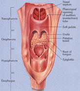 The pharynx is often referred to as the back of the throat. Food pieces, now called bolus, travel from the oral cavity to the pharynx in the process of deglutition, or swallowing. The pharynx is also a shared passageway, connecting the nasal cavity, oral cavity, air passageway, and epiglottis. There are certain structures inside the pharynx to conduct the movement of air and food.