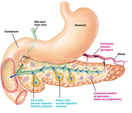 The pancreas also produces hydrogen carbonate (HCO3-) which helps counter the acidic quality of chyme that enters the duodenum from the stomach. This stops pepsin digestion but makes the other secretions of the pancreas more effective.