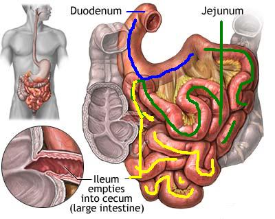 After the duodenum comes the two other parts of the small intestine, the jejunum and the ileum. These are what make up the bulk of the small intestine. The jejunum is the first part while the ileum is the second part. Here, food boluses are digested even further, and some nutrients are absorbed through the walls. The ileum is the longest portion of the small intestine.