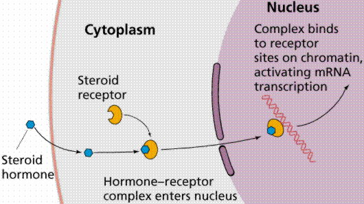 Fat Soluble hormones pass through the plasma membrane of the cell and act in a two step process. Steroid hormones bind, once inside the cell, to the nuclear membrane receptors, producing an activated hormone-receptor complex. The activated hormone-receptor complex binds to DNA and activates specific genes, increasing production of proteins. Steroids are fat-soluble.