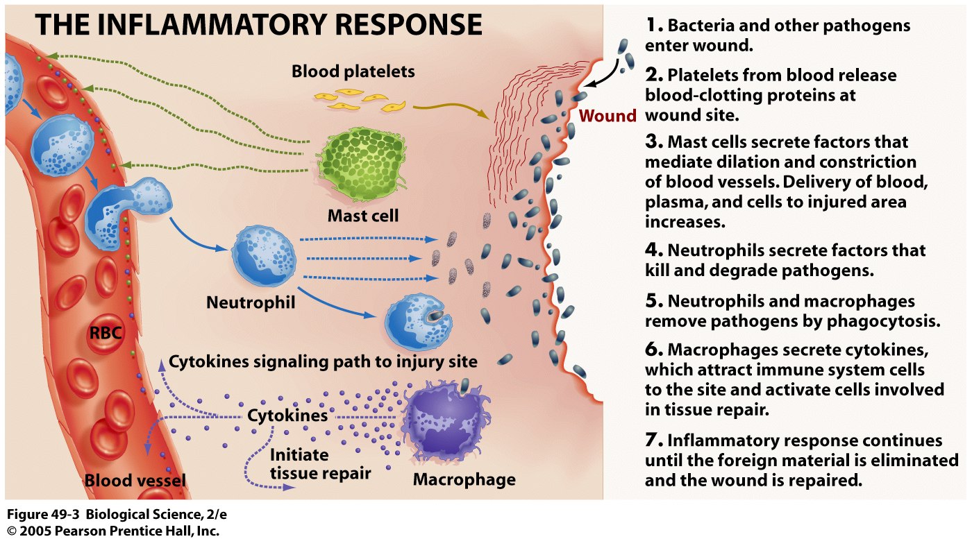 The inflammatory response is the biological response to harmful stimuli, such as burns, chemical irritants, frostbite, physical injury, or pathogen infection. (Given this is the Immune System page, this section will focus on the inflammatory response to pathogen infection.) It is characterized by swelling, pain, redness, warmth, and dysfunction of organs involved (tumor, dolor, rubor, calor, and functio laesa, respectively). Its purpose is to increase blood supply to the area to bring nutrients, proteins, and white blood cells to the affected tissues. Note that the epithelium and the capillaries are separated by interstitial fluid rather than being located right next to each other. In the example a splinter, the following events occur as part of the inflammatory response: