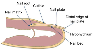 Each nail has a free edge, also known as a nail plate, as well as a proximal root. The deeper layers of the epidermis extend beneath the nail to form the nail bed. The thickened portion of the nail bed is the nail matrix, which is responsible for nail growth. As nail cells are produced in the matrix, they keratinize and slide distally over the nail bed. Nails are mostly pink because of the capillaries supplying the nail bed. The white crescent that lies over the nail matrix is the lunula. The borders of the nails are overlapped by skin folds, called nail folds. The eponychium, or cuticle, is the projection of the proximal nail fold onto the nail body. Below the free edge is the hyponychium, which is where dirt and debris accumulate.