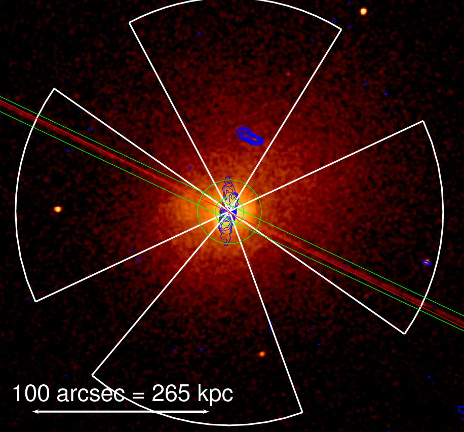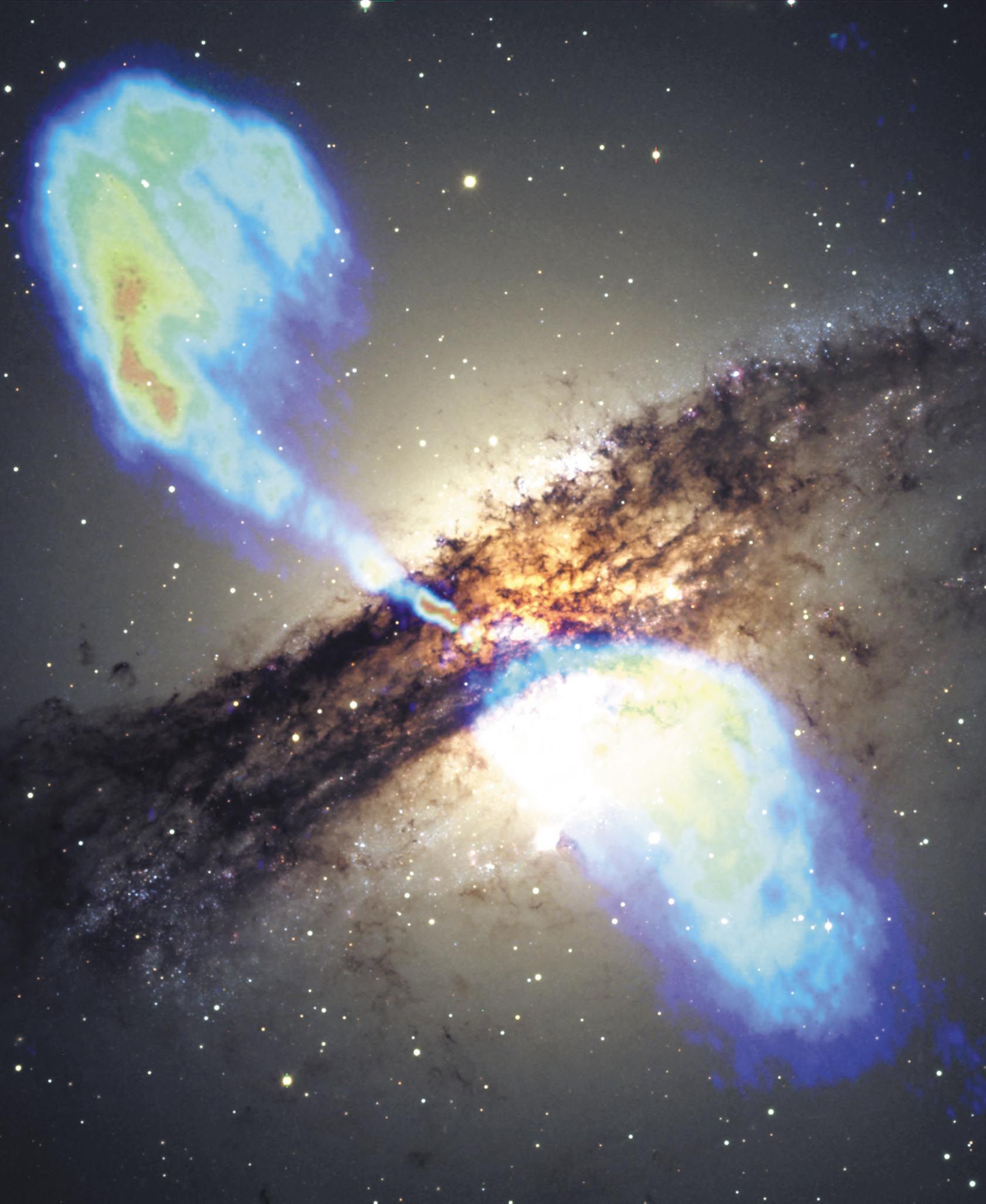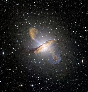 | Cen A is one of the closest radio galaxies containing an AGN to Earth. It is the fifth brightest galaxy in the sky, although it is mostly only observable from the Southern Hemisphere. It is slowly consuming another spiral galaxy, causing rapid star formation, helping the radiation coming from the nucleus. The supermassive black hole at the center sends out jets of X-rays and radio waves in which the inner parts are moving at one half of the speed of light.