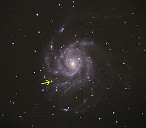 | SN 2006gy was an extremely energetic supernova that reached an extremely high luminosity level. The large size of the star caused it to gain energy in its core, eventually causing it to be blown apart violently. This type of supernova is sometimes referred to a hypernova, and it compared to the star Eta Carinae in the Milky Way.