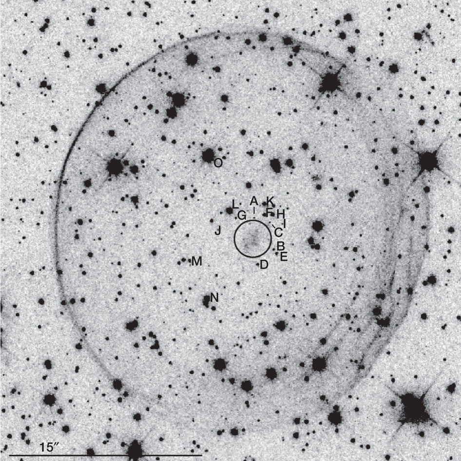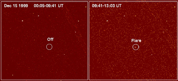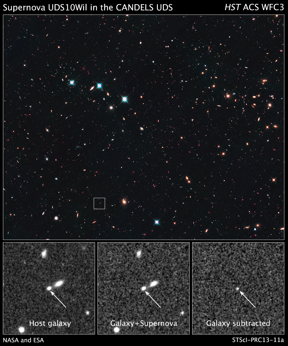 | SN 1996cr is a powerful supernova that was noticed in a Chandra image after it was taken, and was widely studied afterward. The star exploded between 1995 and 1996, but was not discovered until 2001. It is of interest because it is located in an active galaxy with a growing supermassive black hole and rapid star formation.