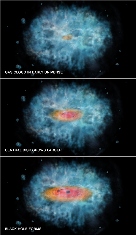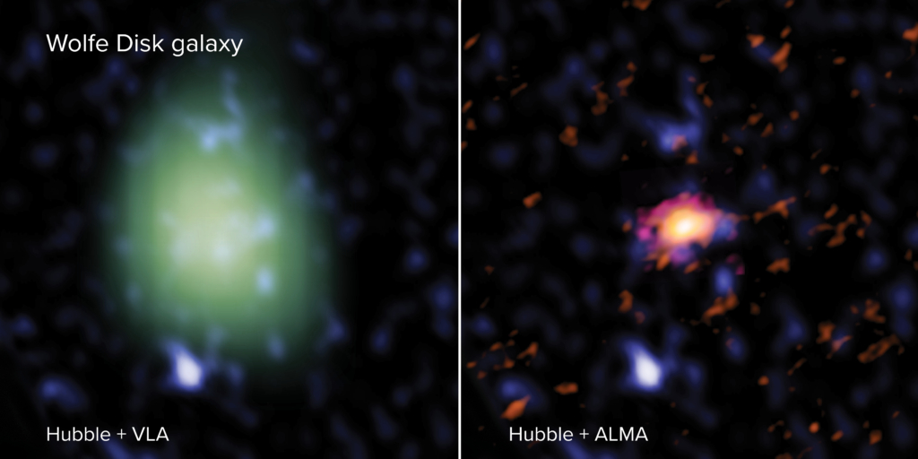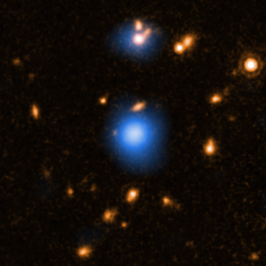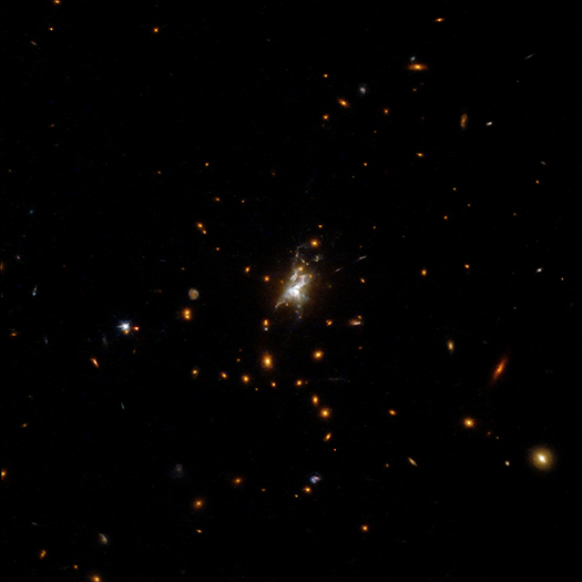 | An extremely distant galaxy cluster, about 10.2 billion years away. This object may help scientists better understand how the universe developed at an early age.