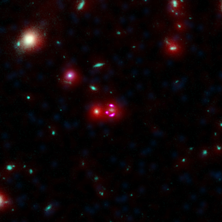 | MACSJ0717.5+3745 (MACSJ0717 for short) a galaxy cluster where four separate galaxies have been involved in a collision. The collisions are caused by a stream of hot gas known as a filament that pours into the cluster. It is one of the most complex clusters ever studied and was discovered in 2003.