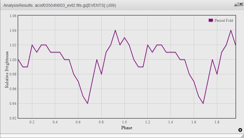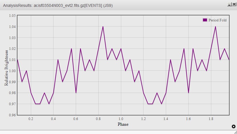 First, we need to draw the region around this neutron star. When doing this, it is important to remember that you want to select the lines extending out from the neutron star as well, shown in the image below. I used two long, rectangular regions to cover these. These extra lines are just light that was spread out from the neutron star when the instrument collected the data. You will have to zoom and pan around the image to completely surround all of them. Now, let’s find the light curve of this neutron star. Use the Analysis > Light Curve function under the NSO Analysis section to get the light curve of this object. When it loads, you find that that looks a bit like a fluffy cat tail. Not directly very useful for analysis. However, generating that light curve allows us to do something else. We can now use Analysis > Power Spectrum to help us find potential periods. When we do this, we find that there are two peaks that show potential (in the image below, the tall peak near the right of the image and the tall peak near the center). Now, let’s test them. Navigate to Analysis > Period Folding. You should see a pop-up window. Set this aside for now. To determine the value in seconds of the potential period, we need to find the frequency in the power spectrum. You can zoom in on any JS9 plot by dragging a square around where you want to zoom in. Let’s zoom in on the tallest peak to see what that one has to offer. You may have to zoom in a couple of times to get a precise enough value. I get one around 0.260585 Hz. To get the period in seconds, we need to do 1/0.260585, which gives us a period of 3.8375 seconds. Now, go back to your period folding window, and enter that value in the empty box. The resulting light curve is shown below. It looks okay, but doesn’t look amazing, don’t you agree? Maybe we ought to try that other peak to see if it yields anything better. Zoom back out of your power spectrum using the blue arrow icon in the top-left corner. Repeat the steps in the paragraph above for this peak. You should get a period of 7.675 seconds, and when plugged into the period folding window, it generates a nice light curve, shown below. Thus, we have determined a period of 7.675 seconds. Note: Differentiating between the two potential periods was difficult. The currently accepted value for this pulsar is 7.66 seconds, but the 3.84 second light curve also generated a good light curve. If in a competition, try to make your best judgment—hopefully the ES considers both possibilities to be correct. |