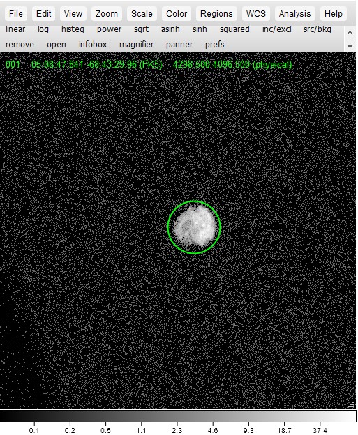 The main purpose of this function is to count the photons (counts) in all of the regions in the image. However, it also tells you how many arcseconds are in each pixel on the image (arcseconds/pixel) which is a very useful conversion factor for getting between arcseconds and pixels. Additionally, this function give you information about the area of the region(s) you are using. This is identical to the Client-side analysis version. | ![]() |