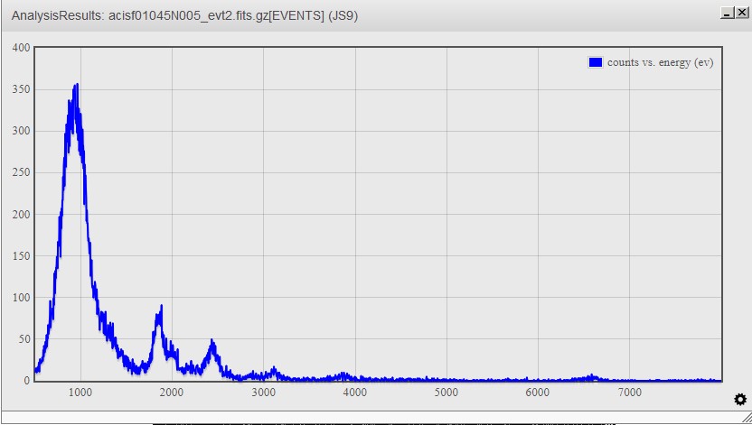 This generates an energy spectrum of all regions. It displays a graph with energy (electron volts) on the x-axis and counts (photons) on the y-axis. This spectrum is extremely useful in an analysis, as it displays X-Ray spectral emission lines of the object. You can then match these spectral lines to their corresponding element (a table of some common lines can be found here) and determine what elements are present in the object. This is very useful for classifying supernovae, as each class will have some specific spectral lines that appear for the specific elements it produces. | ![]() |