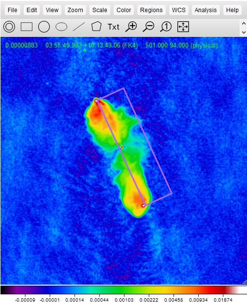 There are several ways you can approach this one. However, because this image was not taken by Chandra, it has some weird formatting, so there is one straightforward way to go about it. Draw a rectangle between the two hotspots (I changed my colormap to sls so that the hotspots are extremely clear), similar to below. Line up the rectangle as if it were a ruler, with the two corners of one edge each touching a hotspot. Now, double-click on the rectangle to bring up the region information. The second and third text boxes show the width and height of the rectangle, respectively. In this case, we want to see how long the long end is, so that will be in the text box that corresponds to height (the box with text highlighted). Make sure FK4, FK5, or ICRS is selected in the top right corner. This is your answer. Note that the quotations in the box corresponds to the unit arcseconds. The final answer is 286.5” |