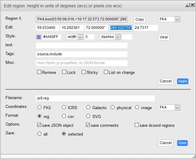 Regions also serve another important purpose: measuring tools. If you place a region on the image and resize it so that it exactly lines up with something you want to measure (for example, the distance between two points, or the radius of a circle), you can use the configuration menu to figure out how large the region is, and therefore, you know the angular measurement.