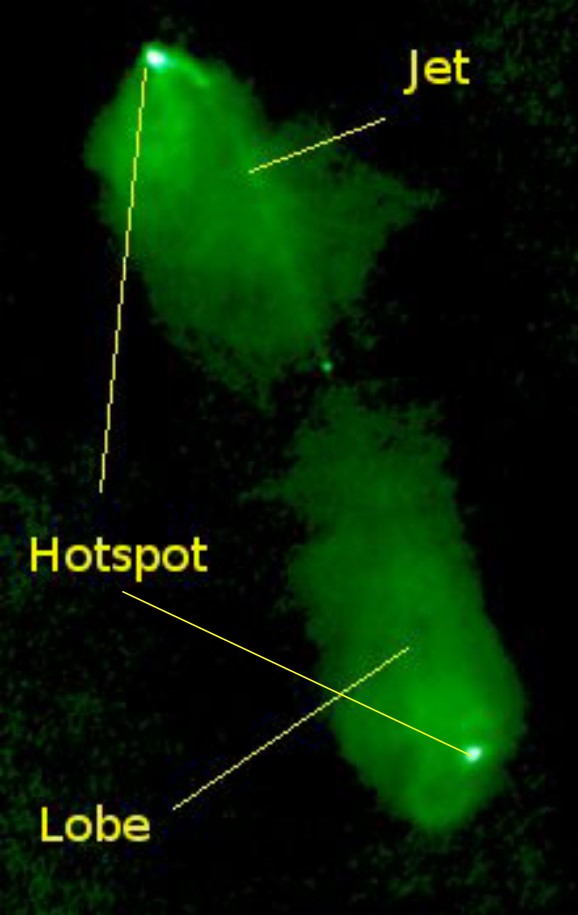 Background: This is a radio image of the radio galaxy 3C98. To complete this question, you will need to know how to identify “hotspots” in a radio galaxy. Hotspots are just the bright points at the end of the radio lobes on either end of the bright nucleus. The following image shows an example of a radio galaxy with the hotspots pointed out.