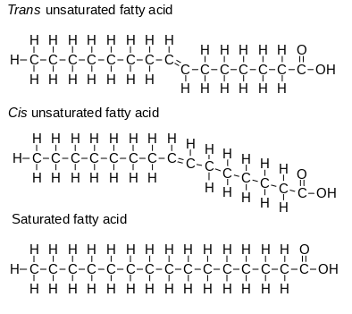 While lipids are not polymers, they are important macromolecules to understand in the context of the cell. Lipids are non-polar, meaning that they will not dissolve in water (which is polar). Lipids store energy throughout the body in the form of fat. Fats are a type of lipid specifically known as triglycerides, which are made up of one glycerol molecule and three fatty acids. A fatty acid is a carboxylic acid with an aliphatic chain consisting of a carbon backbone with hydrogen atoms attached to it. In a saturated fatty acid, all of these carbon atoms are linked by single bonds. In an unsaturated fatty acid, some of these carbon atoms are linked by double bonds. Unsaturated fatty acids can be either cis or trans, which refers to the orientation of the hydrogen atoms on the molecule. In cis fatty acids, the hydrogens surrounding the double bond are on the same side, which results in a bend or kink in the molecule. In trans fatty acids, the hydrogens surrounding the double bond are on opposite sides, which results in a straight chain and no bend in the molecule. This means that the straight saturated fats can pack together more closely, and tend to be solid at room temperature. Unsaturated fats tend to be liquid at room temperature since they do not interact as strongly with each other.