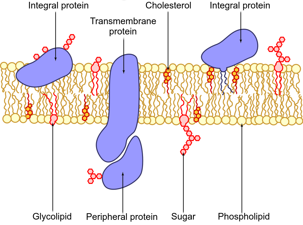 The cell membrane is made up of proteins, lipids, and carbohydrates, with a majority of the cell membrane being made of a phospholipid bilayer (two layers of phospholipids). Proteins are interspersed throughout the cell membrane, being classified as either integral (integrated within the membrane) or peripheral (temporarily adhering to the surface). Monotopic proteins are anchored to the membrane from one side, while polytopic proteins pass through the entirety of the membrane.