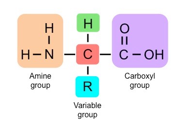 Proteins are long molecules made of building blocks known as amino acids. They are synthesized in the ribosome, based off of the genetic information found in DNA. There are twenty main amino acids, all of which share the same basic structure. Every amino acid has a central carbon with an amino group and a carboxyl group, as shown in the diagram to the right. The only thing that differentiates different amino acids is the R group, also known as the variable group. This group determines the properties of each amino acid, and how they interact to form polypeptides.