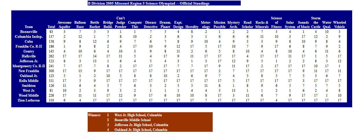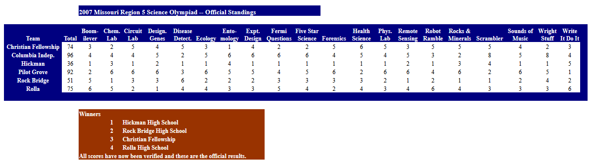 - 2 Scores listed are the final scores which have the second teams from each school not considered in scoring. The raw scores which have all teams considered no matter if there are two from a school, would have Rock Bridge win over Hickman 81 to 82.