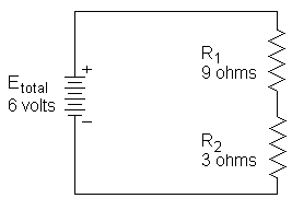 Take this example. There are three resistors, each with different resistance values. If you remember our rule about adding series resistors, you can just add all three values together to the get the resistance over the whole circuit. Now, you've added these values, and you know the voltage for the whole circuit, so using Ohm's Law, find the current by dividing voltage by resistance. Next, use the rule as I stated above to find the voltage drop for each resistor (if you did it right, it should add up to 45 volts).