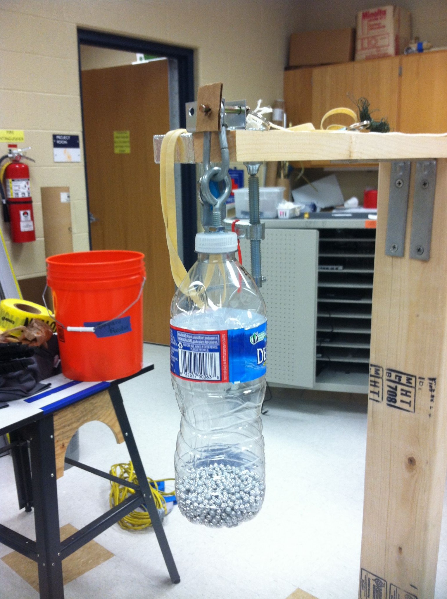 Creating a more reliable testing apparatus will allow you to have better data points to rely on at the competition. A typical bungee testing-device utilizes a soda bottle with mass contained in it and a clamp to hold the cord in place. It is recommended to also have a controlled method of releasing the bottle so that trials are systematic. For an example of a testing apparatus, see the image to the right.