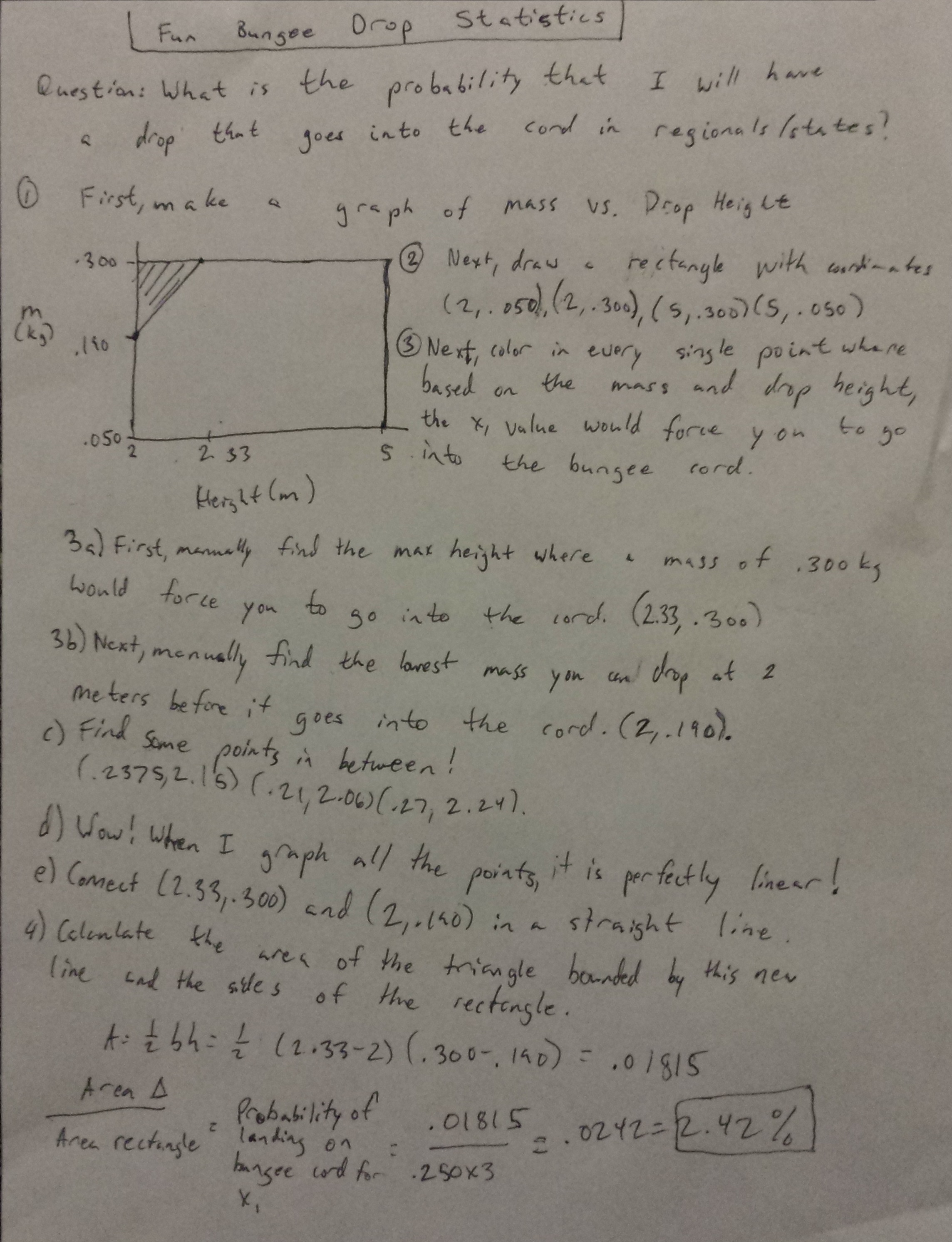 Full Elastic: + Slower drop so that the camera is more likely to catch it if it gets close to the ground (one time at a regionals tournament the guy was recording the drops with his iphone that had a 30fps camera and sometimes the bungee dropped so fast that even though it went really close to the ground, the frame only caught the times when it was about 6cm from the ground) + The strain is guaranteed to be roughly constant throughout all drop heights and hooke's law will not break. + Bungee stretches out slower over time, allowing you to do more trials - Can be hard to measure out the x1 if using rubber bands - I haven't tested it yet. - Very good chance that hooke's law will break given high distances. Partially elastic: + Deriving the equation was easier lol + You can use a measuring tape as the non-elastic portion to account for bungee that stretches out over time. -Drops faster so the camera might not catch it