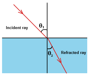 Snell's Law Diagram - is the angle between the incident ray and the normal, is the angle between the refracted ray and the normal, is the velocity of light in the first medium (white), is the velocity of light in the second medium (blue), is the refractive index of the first medium (white), is the refractive index of the second medium (blue).