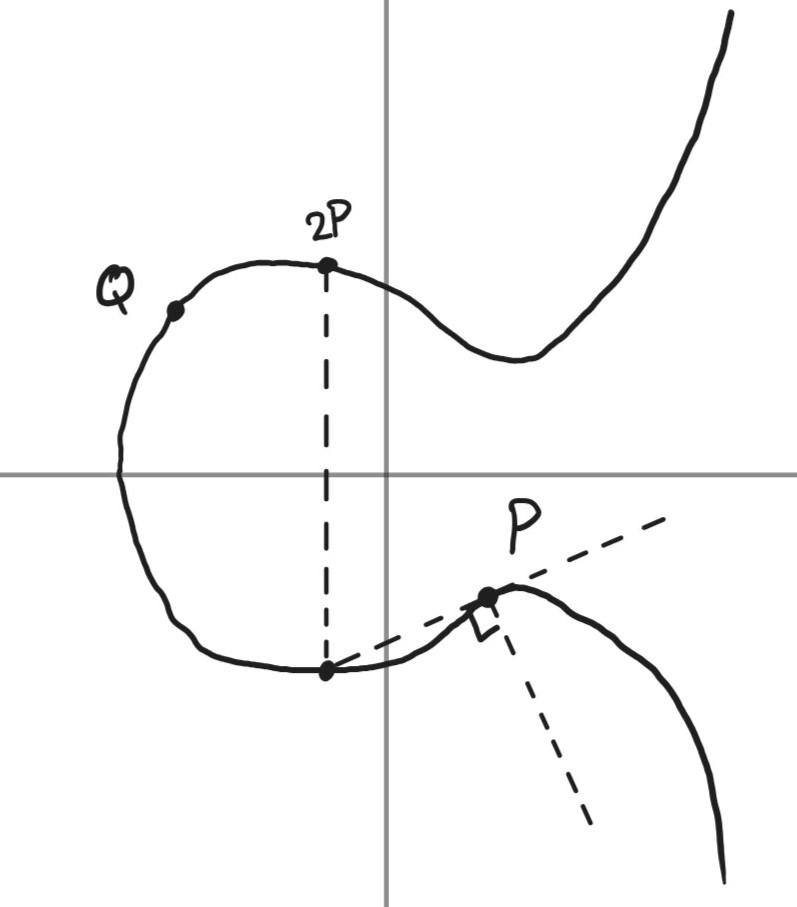 While point doubling doesn't seem intuitively similar to point addition, it performs an almost identical operation. Instead, if we want to calculate or , we take the tangent line at point . Due to the nature of the elliptical curve, the tangent will have only two locations on the curve, one of which is . The remaining intersection point is flipped over the x-axis, and the result is the operation .
