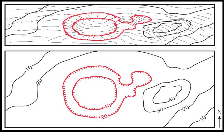 A series of closed contours (the contours make a circle) represents a hill. If the closed contours are hatchured it indicates a closed depression. Contour lines crossing a stream valley will form a "V" shape pointing in the uphill (and upstream) direction.