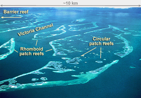 The term "Patch Reef" is commonly used to describe reefs which do not fall under Darwin's reef classification scheme. They are usually clumps of corals that are close to each other, but not connected, usually being separated by sand or muck. There are 2 main types of patch reefs: circular and rhomboid. An image of patch reefs is below.