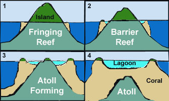 A volcanic island is formed by tectonic activity and the shores are warm where coral can grow. Charles Darwin developed the reef classification system.