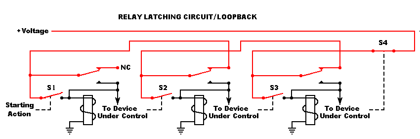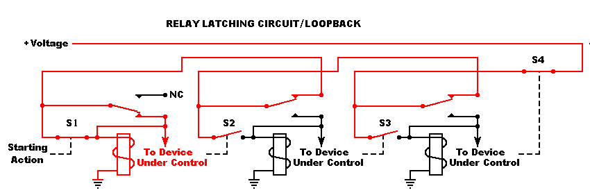 3rd device completes its action, openings S4, releasing the latch and stopping the 3rd device. Since none of the relays are latched, none of the devices will operate, even if S4 closes again.