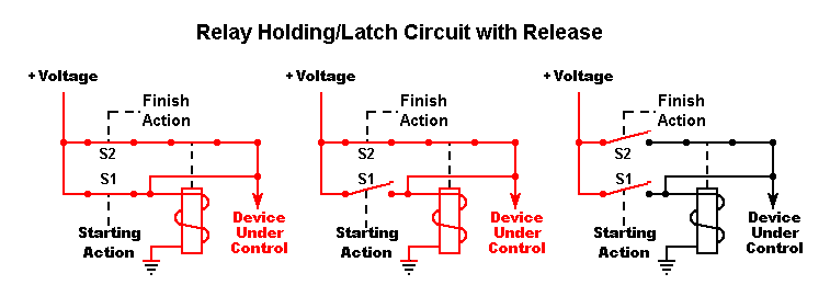 First Diagram: Electricity cannot flow to the Elevator (Device Under Control) because of the normally open contacts of switch (S1) and the relay. Second Diagram: The ball rolls into the elevator, closing S1, energizing the relay coil and starting the elevator. Third Diagram: The elevator lifts the ball off S1, allowing its contacts to open. Normally this would break the circuit and the elevator would stop; however, the closed relay contacts continue supplying current to both the relay coil and the elevator.