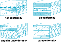 An unconformity, in general, is a gap in the geologic record of a region. There are many types of unconformities.