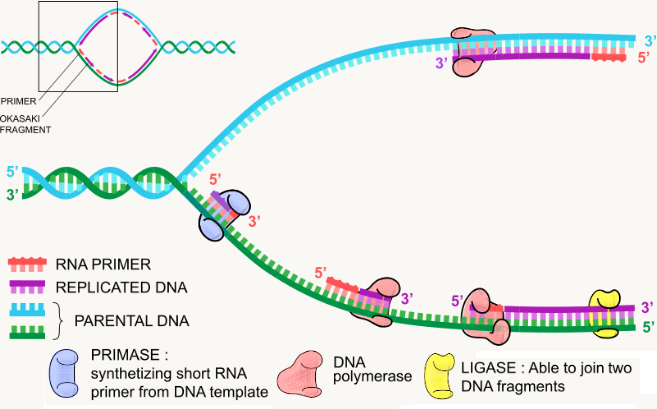 Before DNA polymerase can enter the replication fork to make copies of the DNA strands, primase must put down an RNA "primer" that forms hydrogen bonds with existing DNA bases; this is the starting point for DNA polymerase. The next step is elongation by DNA polymerase, which creates some difficulties because of how enzymes "read." DNA polymerases can only copy from 5' to 3' which works for one strand, called the leading strand. However, the complementary DNA strand is 3' to 5'; this strand is called the lagging strand. While DNA polymerases can copy the leading strand in one piece without a problem, it can only replicate the lagging strand in spurts by replicating small sections in the 5' to 3' direction. The replicated portions of the lagging strand done in spurts are called Okazaki fragments. Each Okazaki fragment requires a new primer before DNA polymerase can copy that fragment. (In eukaryotic replication, only the DNA polymerases involved in elongation have proofreading capability. Therefore, primers are a possible site for errors which are more frequent along the lagging strand.)
