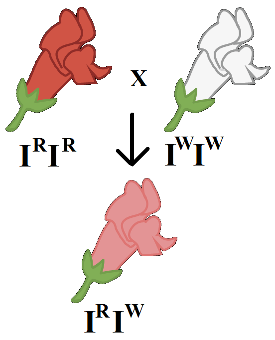 In incomplete dominance, the heterozygous phenotype is an intermediate variety between the two homozygous phenotypes. For example, 4 o'clock flowers have a homozygous red phenotype and a homozygous white phenotype, while the heterozygous condition displays a pink color (see the image at left). Often, incomplete dominance is shown in the allele symbols with an "I" and the first letter of the particular phenotype in superscript.