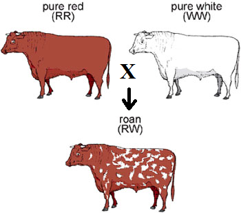 Codominance is very similar to incomplete dominance, but the specifics of the phenotypic interaction are different. In codominance, the heterozygous phenotype displays both homozygous phenotypes in some way. For example, roan cows express both the red and white alleles in patches (see the image at right). Another example of a gene that includes codominance is ABO blood type, described in a later section.