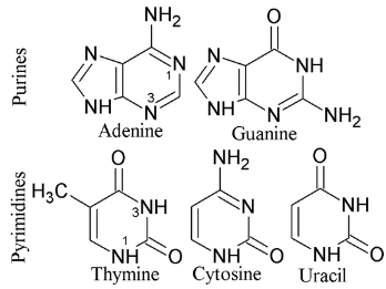 DNA is made up of three components: a phosphate group, a deoxyribose sugar, and heterocyclic (the ring contains both nitrogen and carbon atoms) ring(s) for the nitrogenous base. Purines have two such rings; pyrimidines, one. The bases found in DNA are adenine and guanine (purines), and thymine and cytosine (pyrimidines), and are usually referenced by their first letter A, T, C, or G, especially when writing sequences. Mnemonics for remembering purines vs. pyrimidines are "CUT pie" and "Pure As Gold;" C, U (uracil in RNA), and T are pyrimidines, while A, G are purines; purine is the shorter word and has more rings.