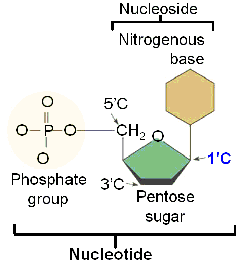 The carbons on the sugar are number with primes (e.g. 3', read as "three prime"). The phosphate group is attached to the 5' carbon, and the nitrogenous base is attached to the 1' carbon. The sugar and phosphate groups form the backbone or the sides of the double helix "ladder" and the nitrogenous bases stick out from the chain like "rungs" of the ladder.